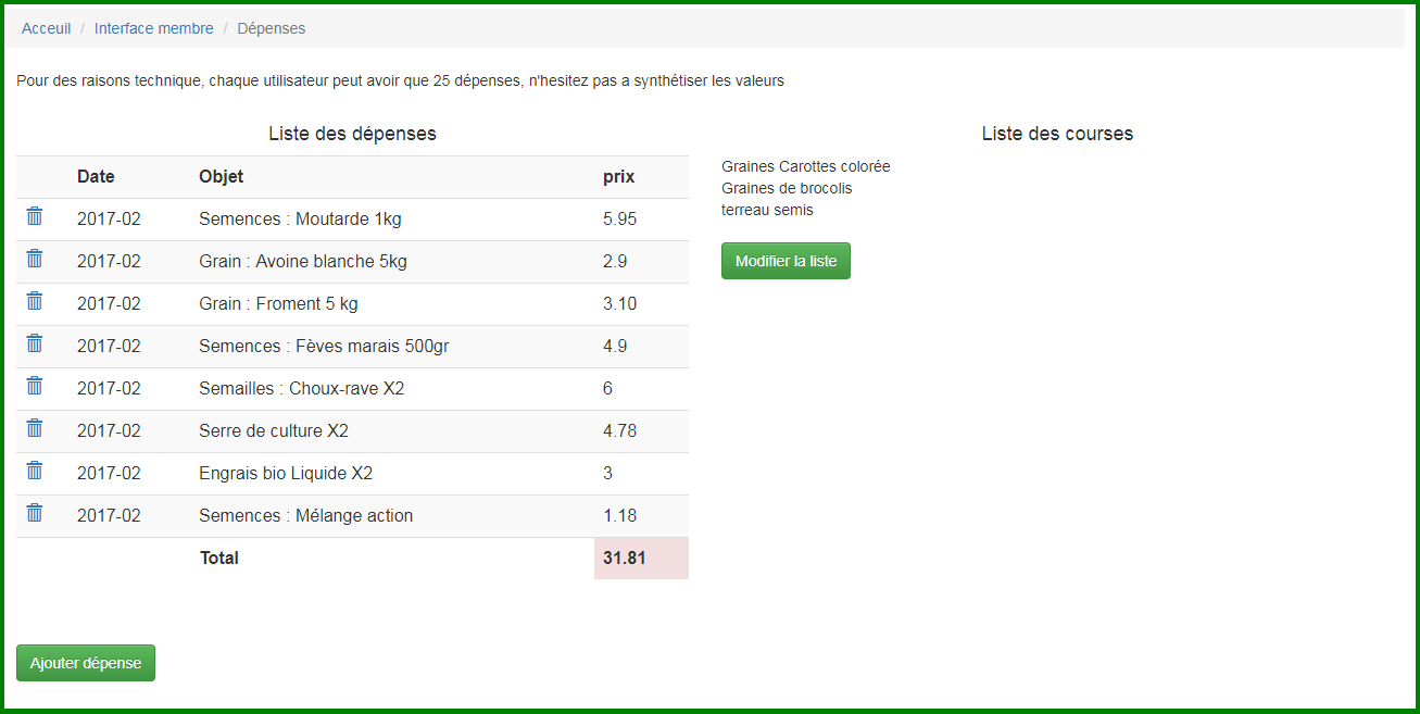 ainsi qu'une liste des courses, la gestion des récoltes et des dépenses,